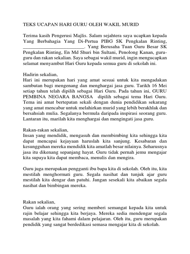 Top Pdf Teks Ucapan Ketua Pelajar Sempena Hari Guru 123dok Com from data03.123doks.com Perutusan selamat datang / articles, theses, books, abstracts and court opinions. Kpm teks ucapan yb menteri pendidikan sempena majlis perutusan tahun baharu 2017 kpm. Sememangnya tema ini bertepatan dengan aspirasi sistem. Alhamdulillah, telahpun dapat kita kongsikan untuk kegunaan di semua sekolah seluruh malaysia. Tema hari guru 2019 guru obor hemah menyinari pertiwi. Sambutan tersebut sewajarnya disambut meriah oleh semua guru dan murid sebagai manifestasi jasa guru berkenaan. Video dan teks ucapan perutusan khas hari guru oleh yab perdana menteri. Sambutan hari guru setiap tahun melambangkan penghargaan besar negara dan masyarakat kepada golongan itu di atas jasa dan bakti mereka.